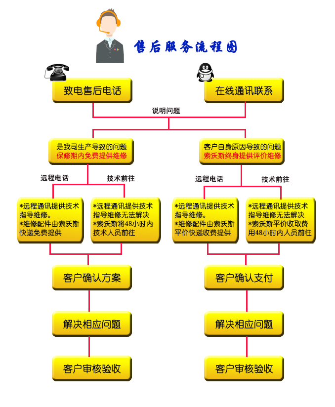 如果需要維修,索沃斯技術(shù)人員將通過客戶所在地的呼叫中心安排服務(wù)。索沃斯不排除上門服務(wù)可能由索沃斯服務(wù)合作伙伴提供。
